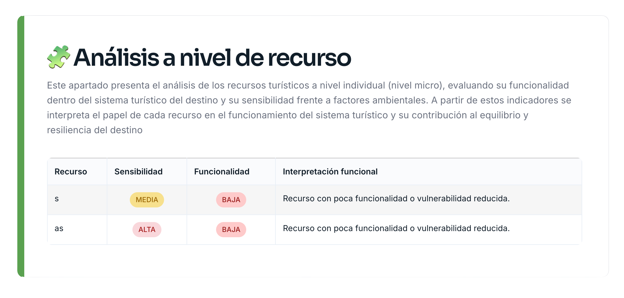 BLUEToUR analiza el destino como un sistema, integrando recursos turísticos, servicios, estado de conservación y relaciones territoriales. Esto permite identificar fortalezas, debilidades y dependencias clave de forma clara y comparable.